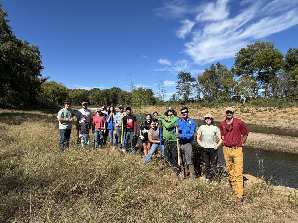 That spring effort came full circle in the fall during the War Eagle Creek Workshop and Planting Event on October 16, when nearly 600 of the native trees, potted in spring, were planted along War Eagle Creek to support streambank stabilization and habitat restoration. The event was hosted in partnership with the Beaver Watershed Alliance and the Arkansas Game and Fish Commission, with additional support from the U.S. Fish and Wildlife Service, SARP, Bass Pro Outdoor Fund, and Beaver Water District.