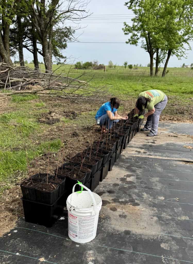Above: Volunteers pot over 1,000 native tree and shrub seedlings in spring 2025, preparing them for planting later that fall