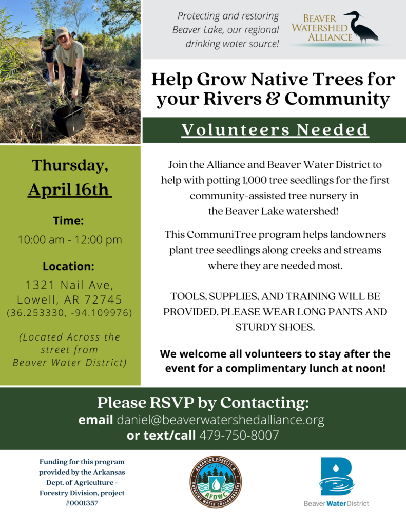 Join us at Beaver Water District on April 16th to help with potting 1,000 tree seedlings for the first community-assisted tree nursery in the Beaver Lake watershed! This CommuniTree program helps landowners plant tree seedlings along creeks and streams where they are needed most.