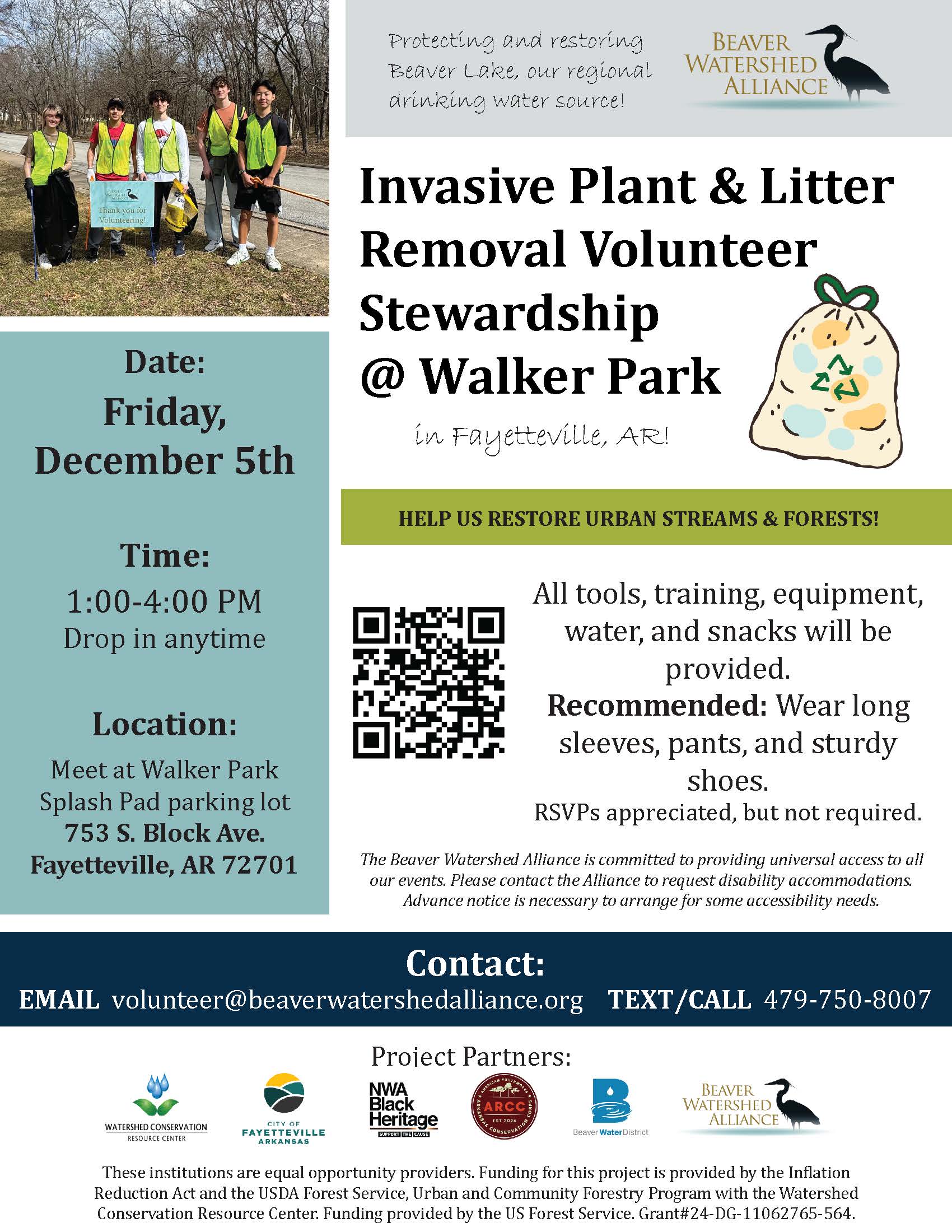 Join us for an invasive plant and litter removal volunteer event at Walker Park in Fayetteville on Friday, December 5, 2025, from 1:00-4:00 PM! Volunteers are welcome to drop-in anytime. We will be removing invasive plant species and litter from this important community park. Help us restore Spout Spring Branch and the urban forests around Walker Park!
