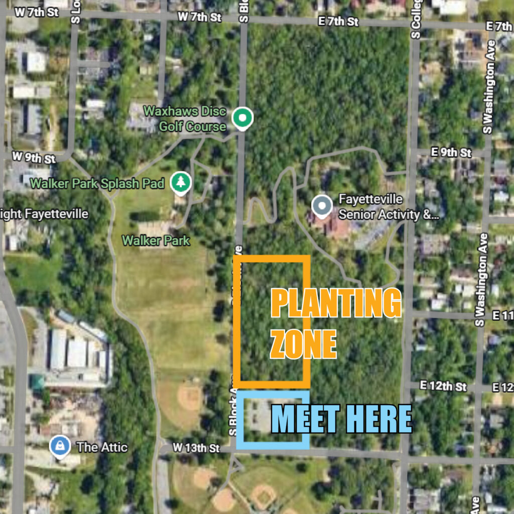 All tools, equipment, training, water, and snacks will be provided. Recommended: wear long sleeves, pants, and sturdy shoes. Meet at the parking lot @ the corner of W. 13th Street & S. Block Avenue, Fayetteville, AR 72701 (Coordinates: 36.050675, -94.160520) (see map below).