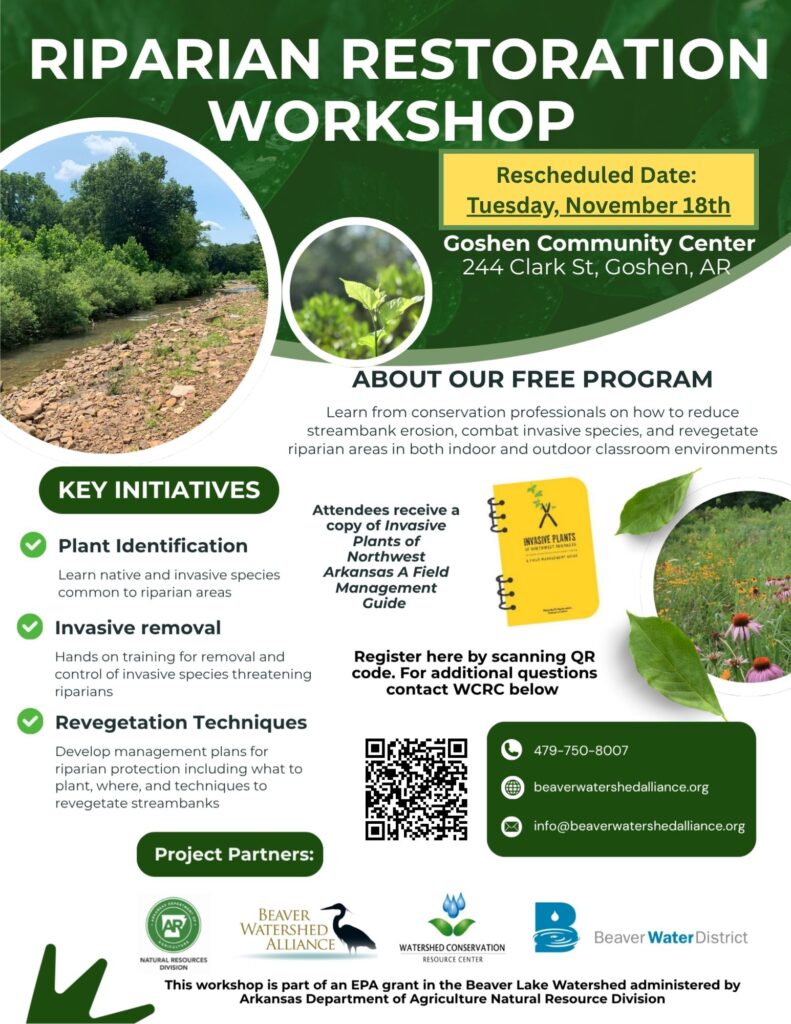 Registration is free but RSVP required. Email info@beaverwatershedalliance.org or call 479-750-8007 to register and save your spot; seats fill up fast!