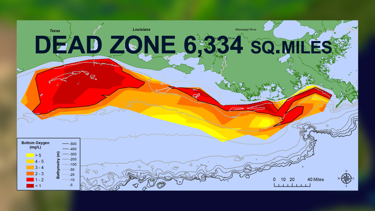 Current Gulf Hypoxic Zone spans 6,334 square miles.
