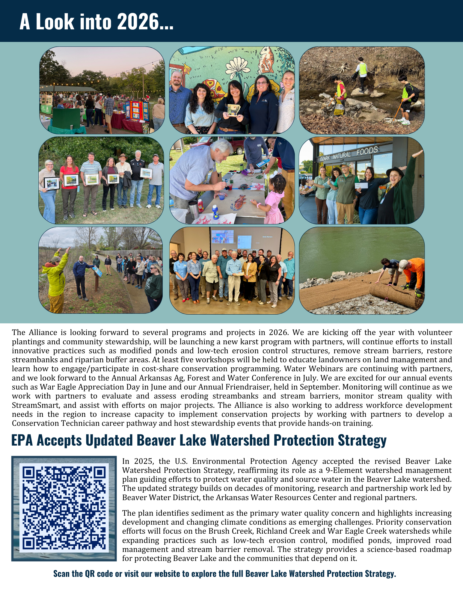 The Beaver Watershed Alliance (Alliance) works to proactively protect, enhance, and sustain the high-water quality of Beaver Lake and its tributaries through voluntary best management practice implementation, outreach and education, and planning and analysis activities.