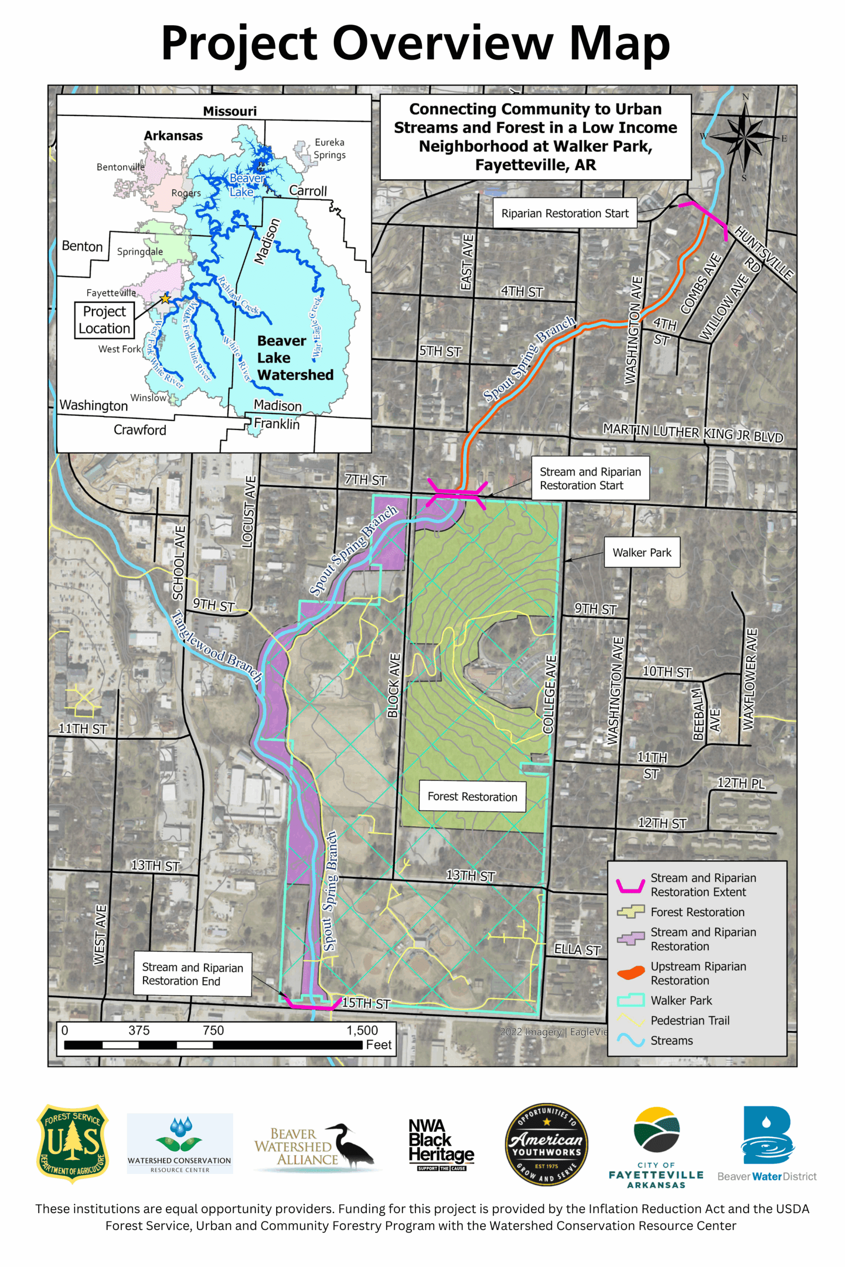 Project Partners: USDA Forest Service – Inflation Reduction Act Urban and Community Forestry (funder), Watershed Conservation Resource Center (awardee and project lead), Northwest Arkansas Black Heritage, Beaver Watershed Alliance, American YouthWorks and Arkansas Conservation Corps, City of Fayetteville, and Beaver Water District.