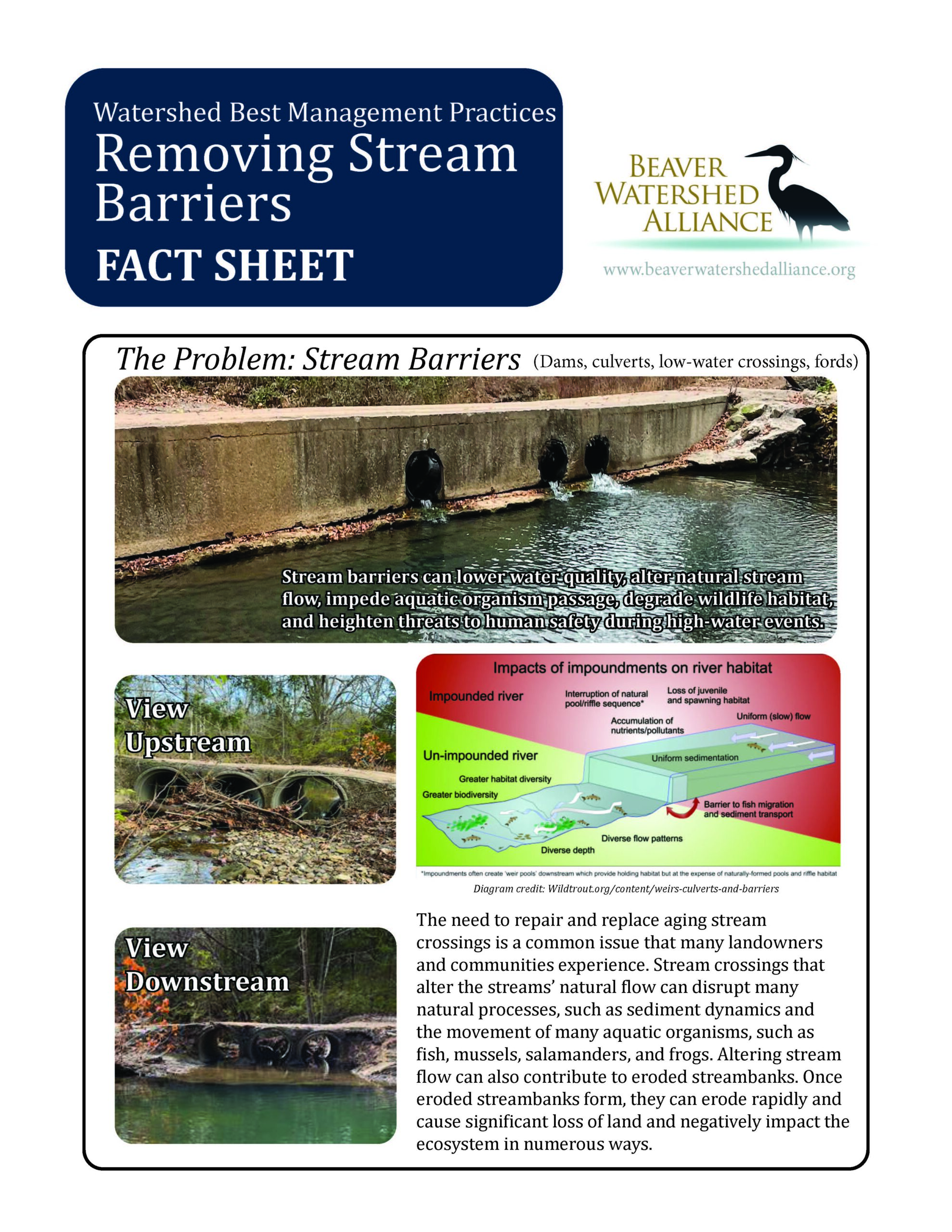 Stream barriers can lower water quality, alter natural stream flow, impede aquatic organism passage, degrade wildlife habitat, and heighten threats to human safety during high-water events.